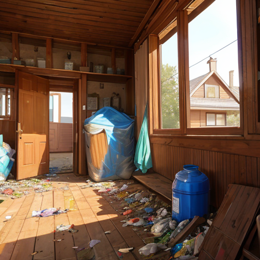 ゴミが散乱している人がすんでいなさそうなゴミ屋敷の絵、引っ越し後の片付け中なのかも、こんな家を住めるようにするのはかなり大変そう