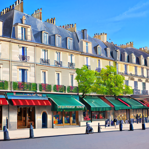 整った建物が魅力的なパリの外の風景イラスト、日本では見ないような建物の外観、一階はすべて出店になっているよう