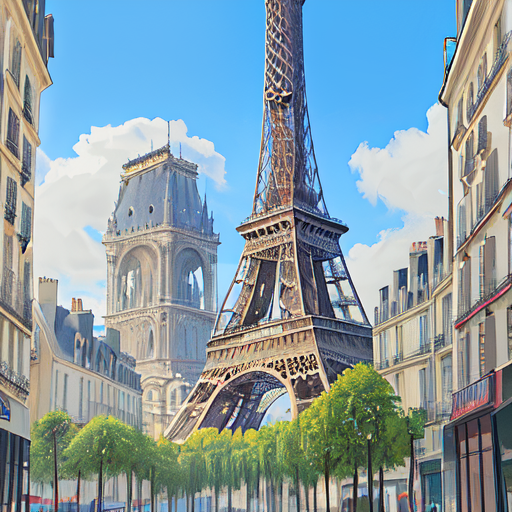 エッフェル塔とその周りの建物の背景絵、木もたくさん生えていて自然豊か、フランスの外の風景という感じ